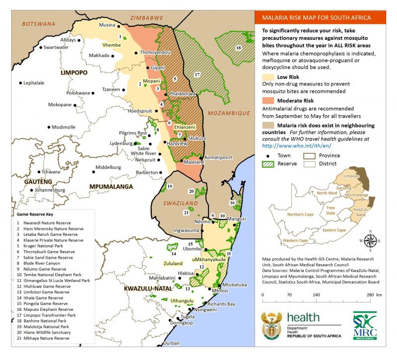 The malaria risk map as released by the Department of Health. Map produced by the Health GIS Centre, Malaria Research Unit and South African Medical Research Council. To significantly reduce your risk, take precautionary measures against mosquito bites throughout the year in ALL RISK areas. Where malaria chemoprophylaxis is indicated, mefloquine or doxycycline or atovaquone proguanil should be used.